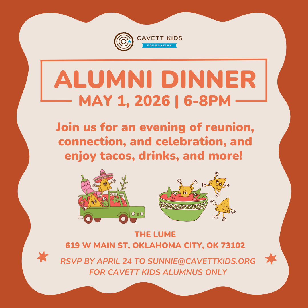 Alumni Dinner Friday, May 1, 2026 6:00 PM 8:00 PM 18:00 20:00 The Lume 619 W. Main Street Oklahoma City, OK, 73102 United States (map) Google Calendar ICS Join us for an evening of reunion, connection, and celebration, and enjoy tacos, drinks, and more! To RSVP, email sunnie@cavettkids.org by April 24.
